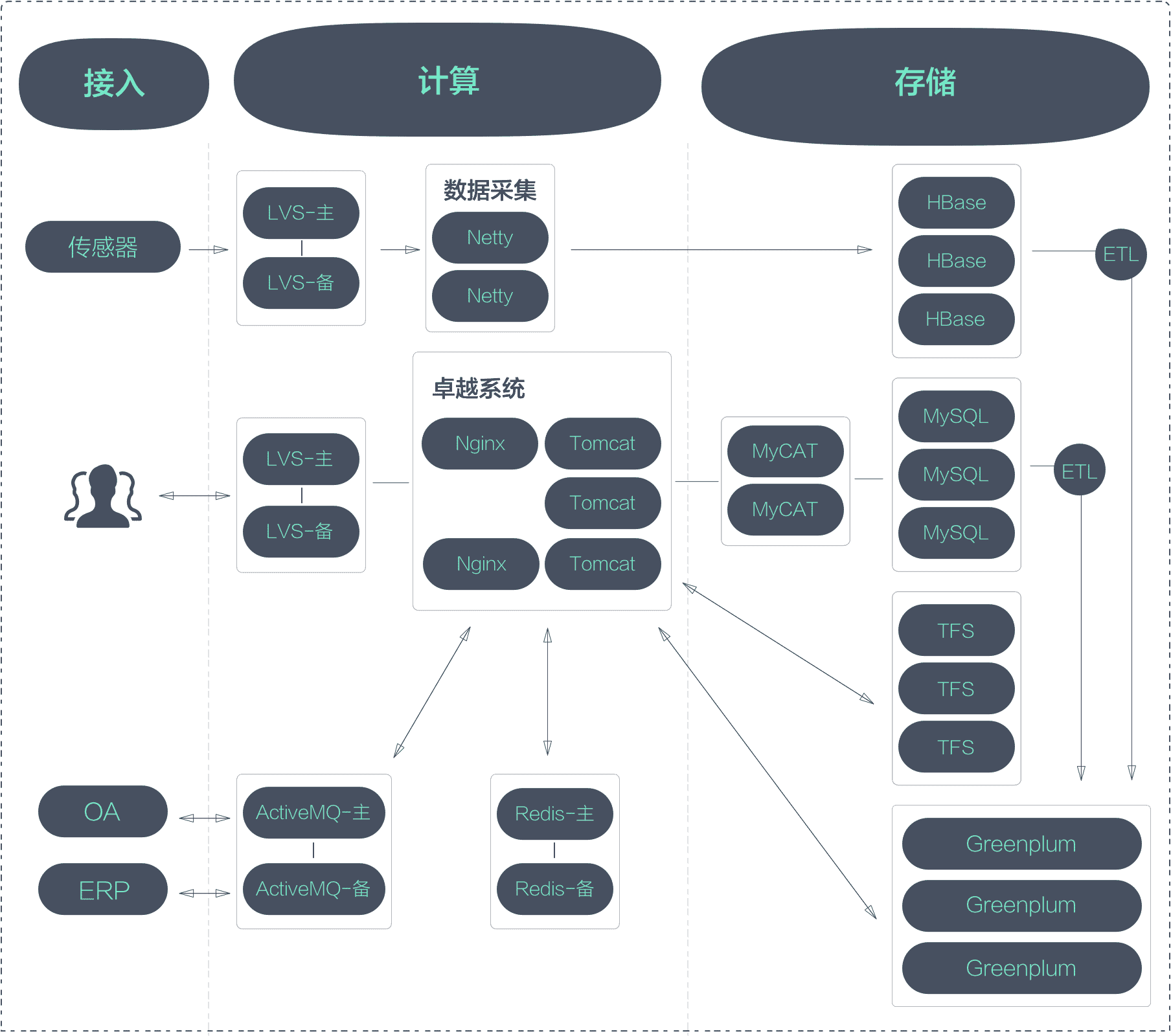- 結(jié)構(gòu)化數(shù)據(jù)(生產(chǎn)和生產(chǎn)支持)存儲在關(guān)系數(shù)據(jù)庫(MySQL和Greenplum)上,半結(jié)構(gòu)化數(shù)據(jù)(傳感器和檢測)存儲在HBase上,非結(jié)構(gòu)化數(shù)據(jù)(圖片、視頻和文件)存儲在TFS上;